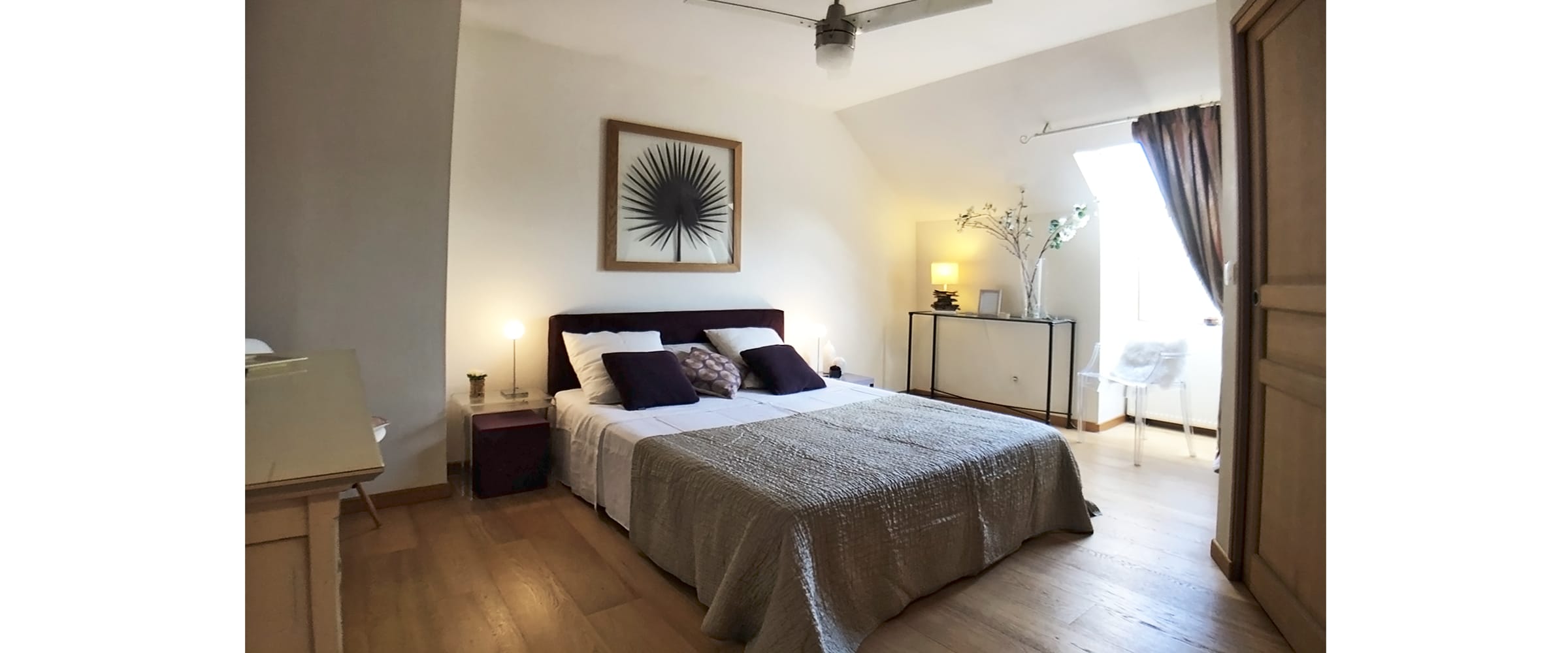 Relooking d’une suite parentale. Les clients voulaient un lieu calme, apaisant avec des éléments de nature avec des couleurs claires et du violet . La nature est entrée avec un très joli tableau herbier de chez Jardin Pamplemousse dont la feuille de Cycas a été teinte en violet, et dans la salle de bain avec les galets dans la douche.